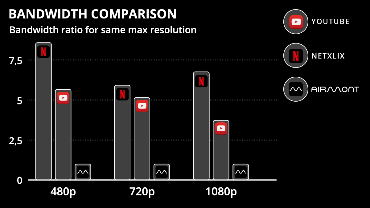 With Airmont, each stream bandwidth can be reduced to the specified limit saving 75% of airtime and transported using robust protocols supporting up to 10% packet loss. More users can enjoy a seamless video experience at the same time and it saves some bandwidth for other usages, such as surfing on the internet or using WhatsApp.