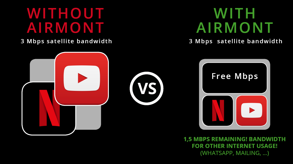 Without Airmont, applications natively use the bandwidth specified by each streaming service provider. Due to satellite latency, video stream will often be on hold and face “buffering” issues. Moreover, the bandwidth is not enough to support many simultaneous streams and the cost of each stream is significant.